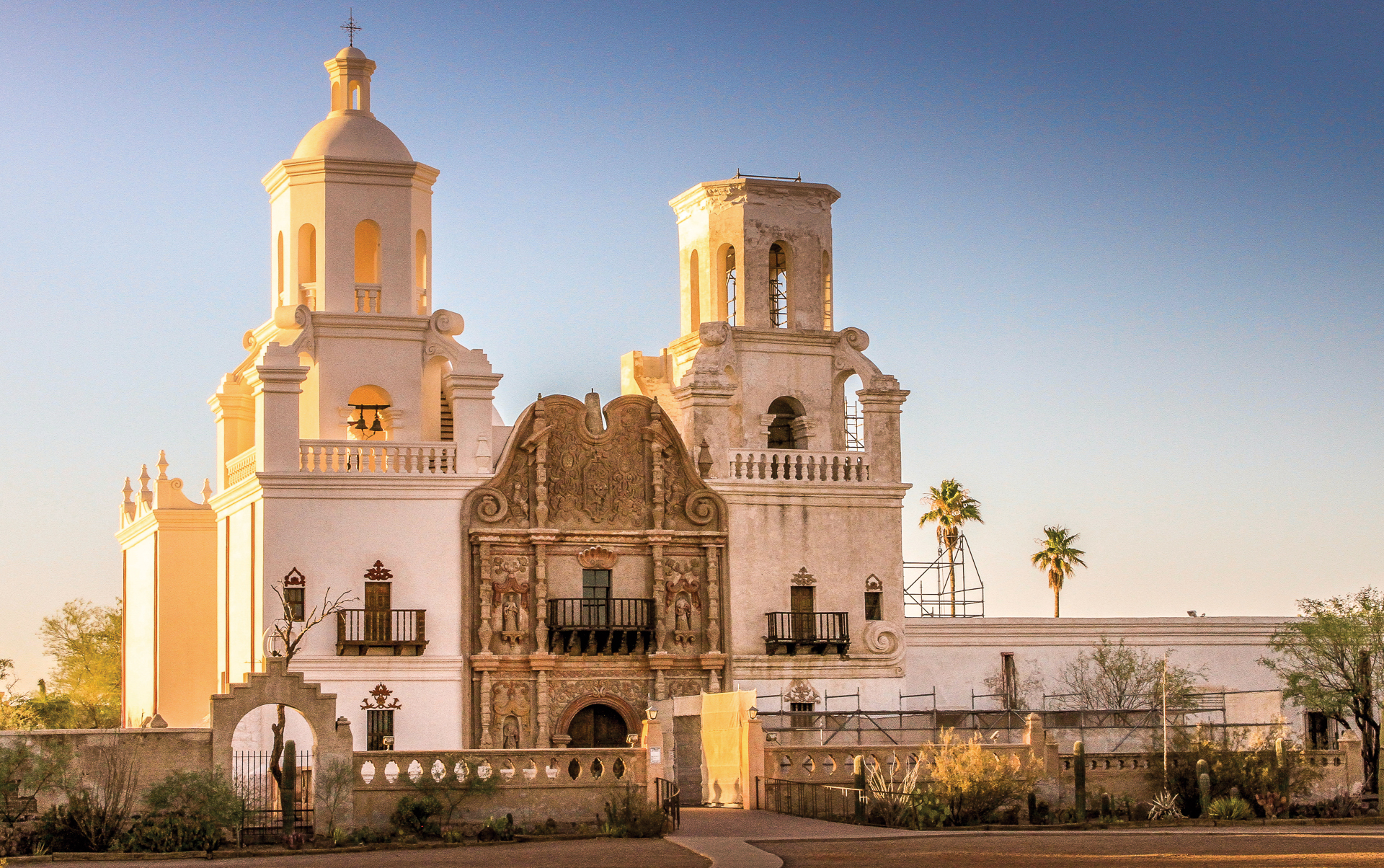 Mission San Xavier del Bac is an active parish, with daily masses and an ongoing restoration process. Construction on the baroque church began in 1783, marked by an ornate entrance flanked by two bell towers, one of which was never finished.
