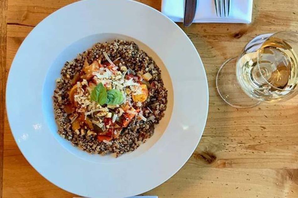 Homey and hearty, the Ratatouille at Tinderbox Kitchen touts smoked eggplant, carrots and zucchini on a bed of ancient-grains pilaf, sprinkled with Parmesan cheese, walnuts, and basil chips.